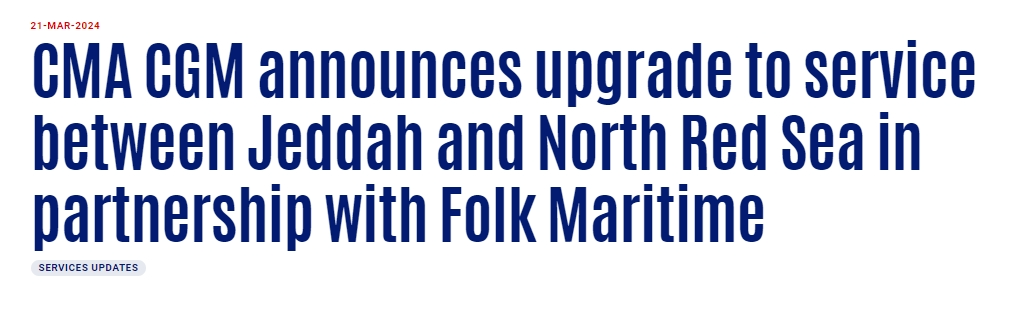 此外,达飞CMA CGM近日在其官网发布公告,宣布已与沙特阿拉伯新成立的集装箱运输公司Folk Maritime签署了一项协议,双方将在红海北部联合运营一条新航线。