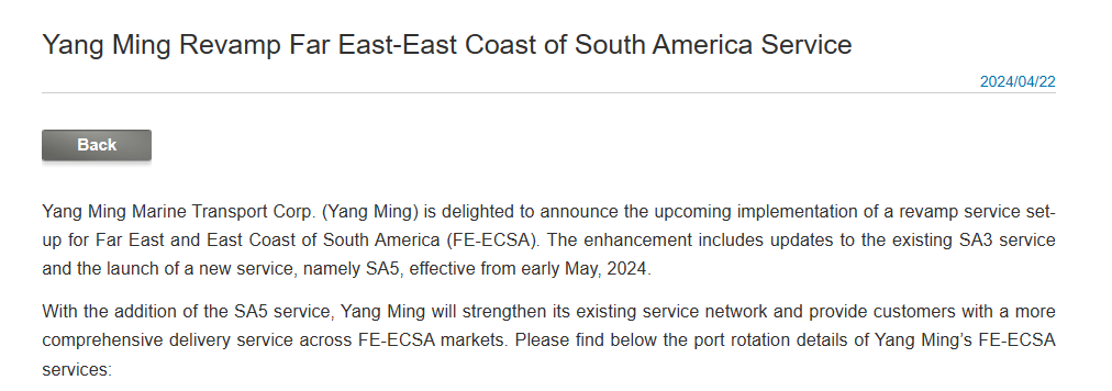 此外,阳明海运近日也宣布将改造远东至南美东海岸的航线,包括更新现有的SA3服务,并推出一项新服务——SA5,自2024 年5月初起生效。